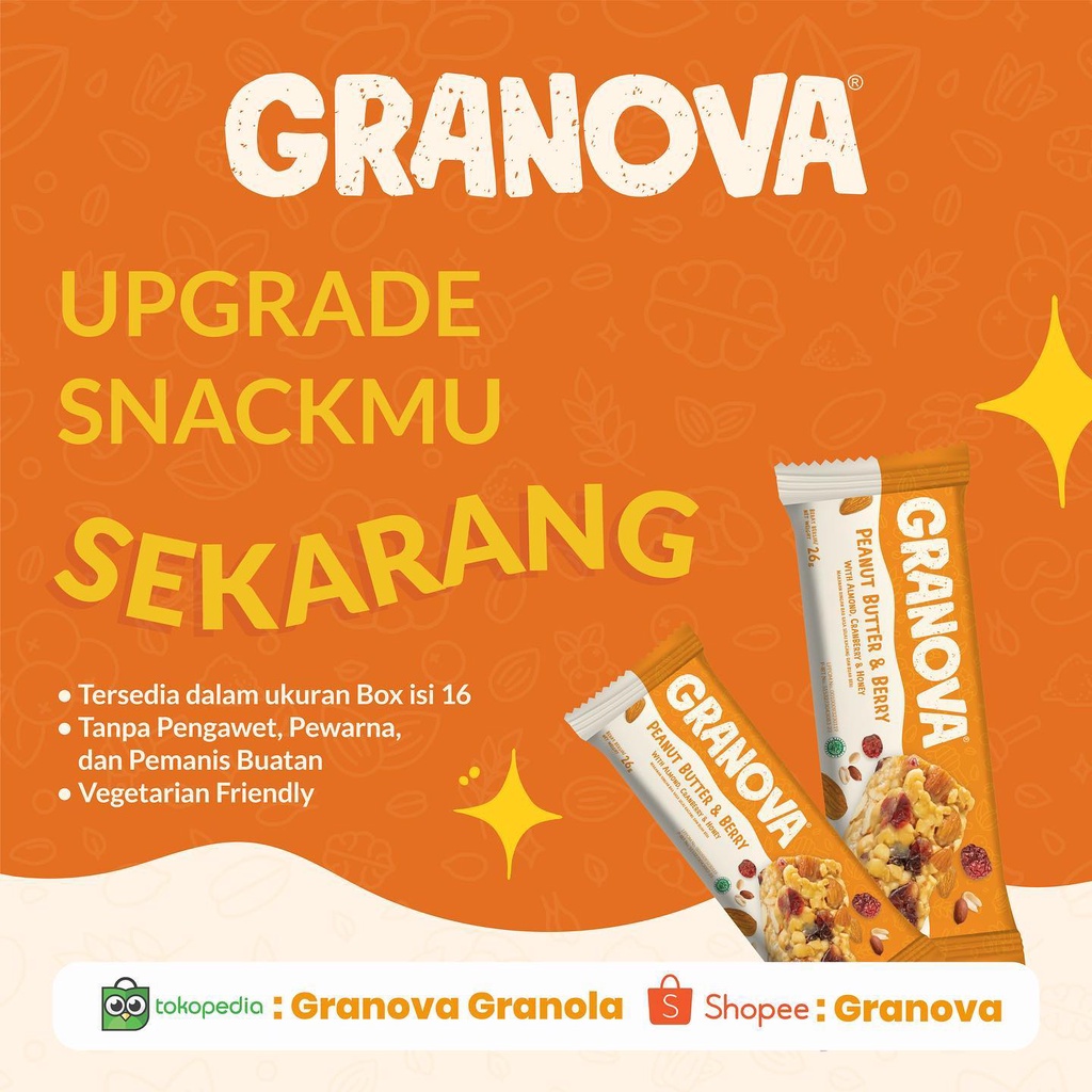 Snack Bar dari Granova mengandung banyak kebaikan hingga 12 jenis biji-bijian dan buah asli dalam satu kemasan: 1. Kacang almond 2. Sereal beras / puffed rice 3. Walnut 4. Madu 5. Biji labu / pumpkin seeds (tergantung varian) 6. Biji bunga matahari (tergantung varian) 7. Kacang mede (tergantung varian) 8. Kacang tanah (tergantung varian) 9. Cranberry kering (tergantung varian) 10. Kelapa kering (tergantung varian) 11. Coklat (tergantung varian) 12. Selai kacang (tergantung varian)