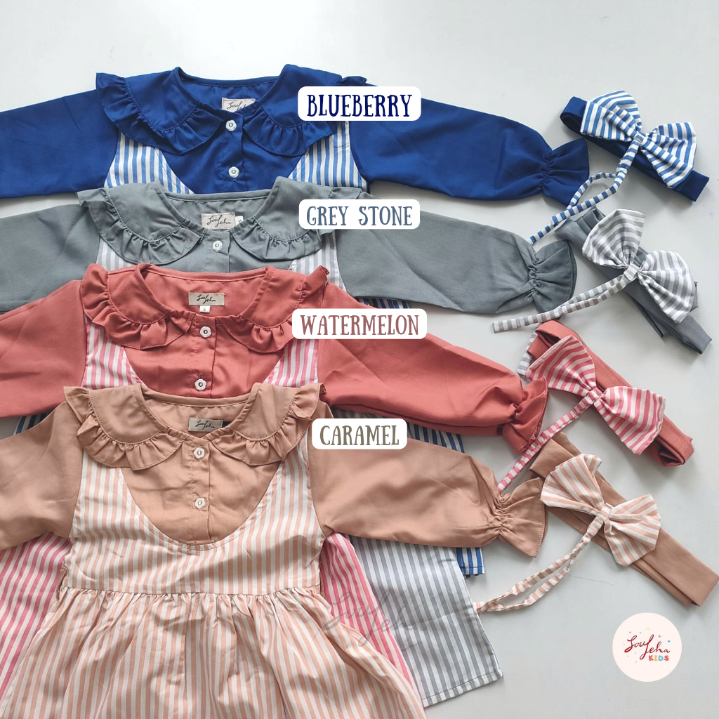 Detail Produk : - Kerah model kupu-kupu Korean Style - 3 kancing bunga cantik di bagian depan dada - Lengan tangan ruffle karet (stretchnya pas) - Tali pinggang dan aksen pita pinggang yang bisa dilepas-pasang dapat dikreasikan berbagai model outif anak sesuai keinginan - Inner toyobo yg warna polos menyatu dengan bawahan katun salur