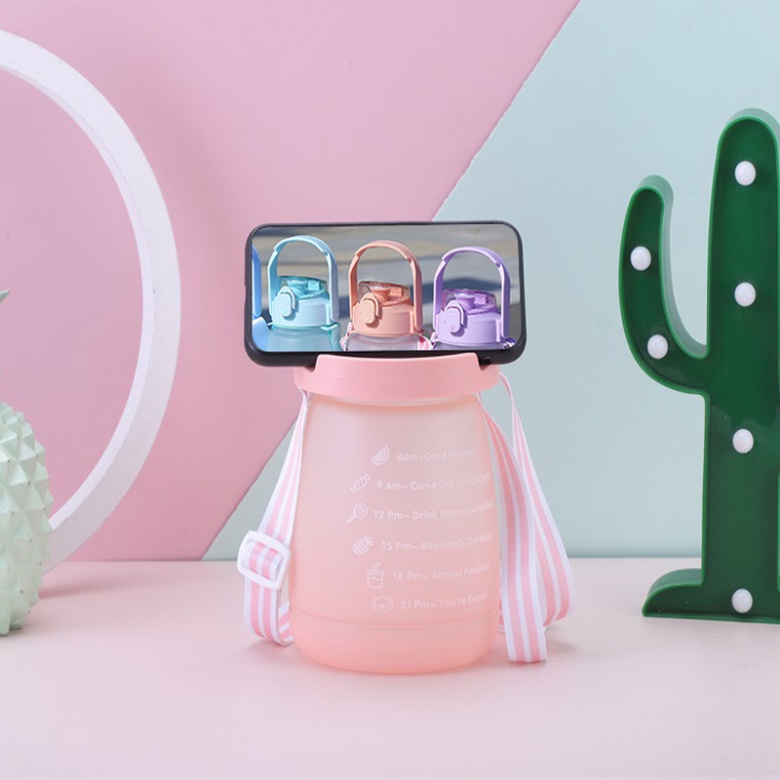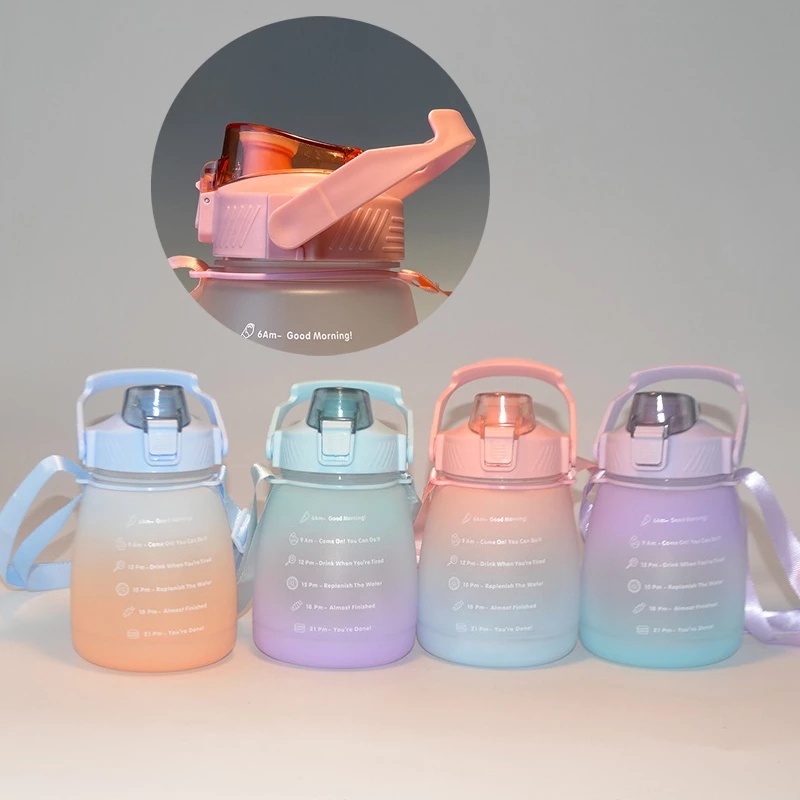 ✅Informasi produk: Kapasitas: 2000ml Bahan botol : PC + PP + food grade silikon (tidak disarankan untuk minuman panas) Warna: merah muda/biru/ungu/hijau Ukuran: 31cm*12cm*12cm/12.2inch*4.72inch* Mulut botol : Tutup Flip-Flop mengunci dengan sedotan Ketahanan : anti bocor, tidak bocor/rembes Permukaan botol air : dengan penanda waktu dan kata kata yang memotivasi Berat: 300g kapasitas: 1500ML