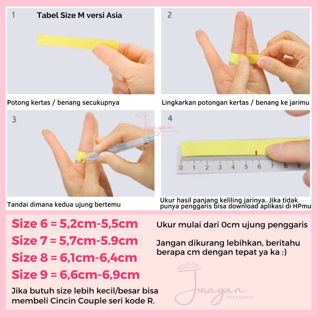 Size 6 = Lingkar jari 5.3 sampai 5.6 cm Size 7 = Lingkar jari 5.7 sampai 5.9 cm Size 8 = Lingkar jari 6.1 sampai 6.4 cm