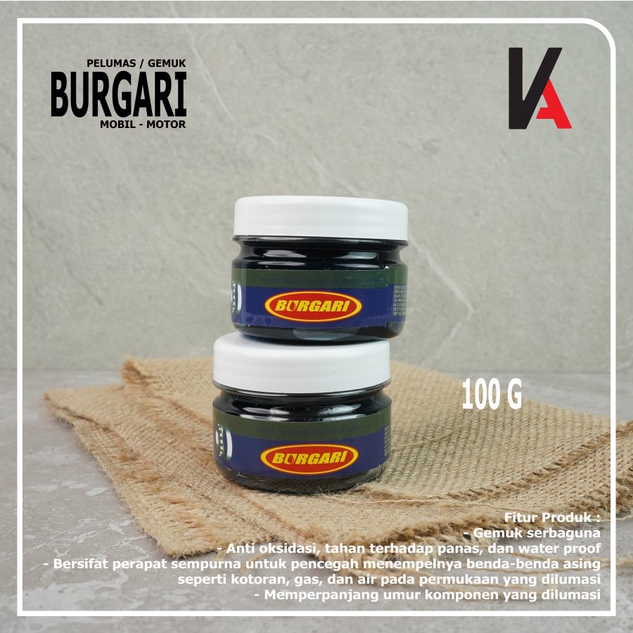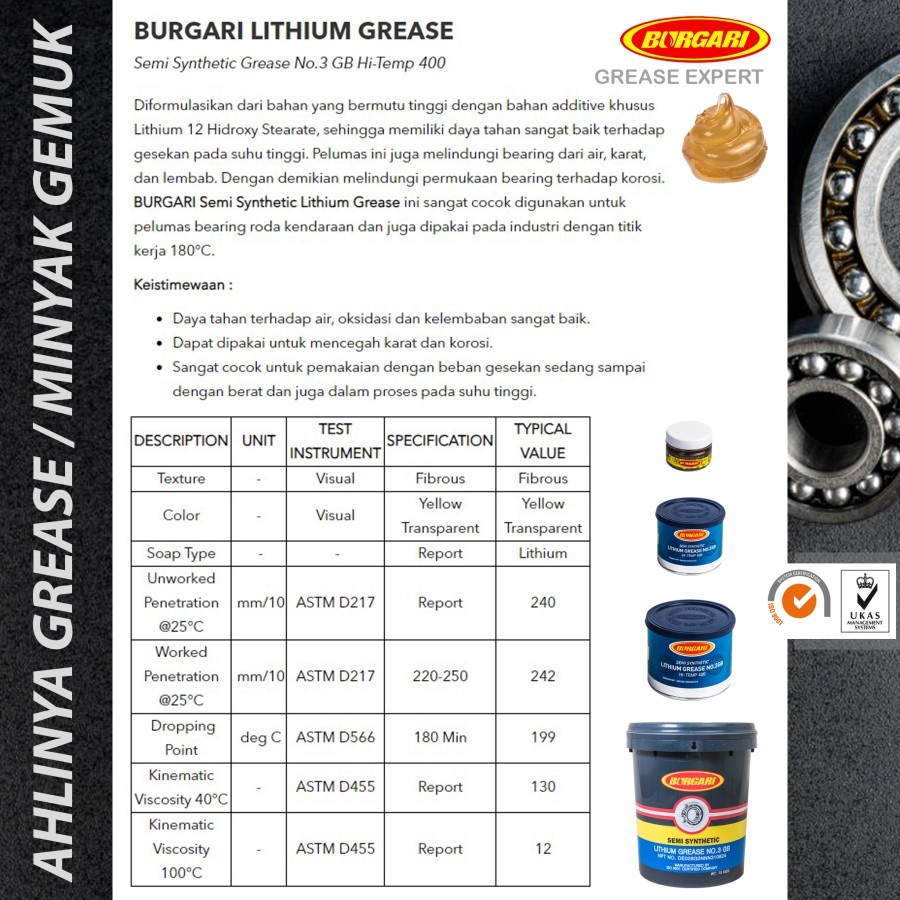 Burgari Semi Synthetic Lithium Grease No.3GB Hi-Temp 400 Gemuk Bearing Roda [100g] merupakan cream pelumas yang memiliki anti oksidasi, tahan terhadap panas, dan water proof, serta memperpanjang umur pakai komponen yang dilumasi. Dapat digunakan pada chassis dan truck roller, bearing roda/ban, pompa air, dan lainnya.