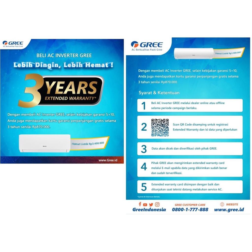 Gree juga ada campaign khusus untuk perpanjangan Garansi Service untuk tipe inverter Gree (F1S & F5S) dengan jumlah penambahan garansi sebanyak 3 Tahun perpanjangan Garansi Service