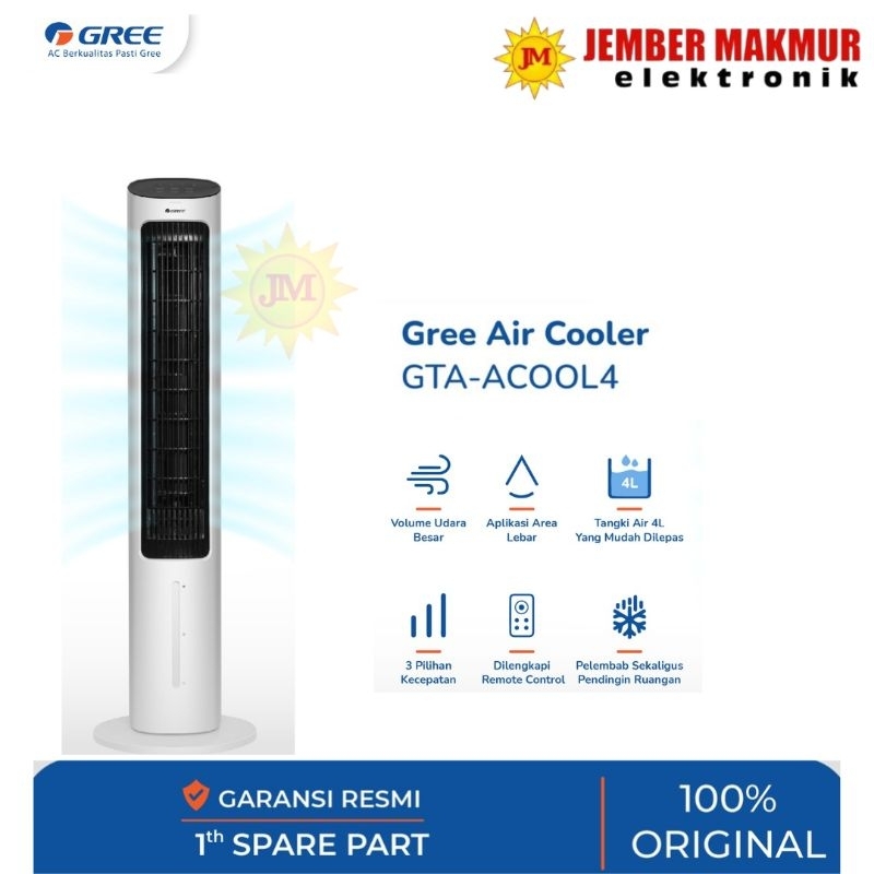 Tipe Produk: GTA-ACOOL4 Nama Produk : Gree Tower Air Cooler Warna : White Daya Input : 50W Kecepatan Angin : 3 Type Frekuensi : 50 Hz Swing Setting : Auto Timer : 7 Jam Kapasitas : 4L Remote Control : Infrared Remote Control Mode : 3 Type Noise : 《 63 db Dimensi Produk : 290 x 290 x 1083 berat : 6kg Garansi : 1 Tahun