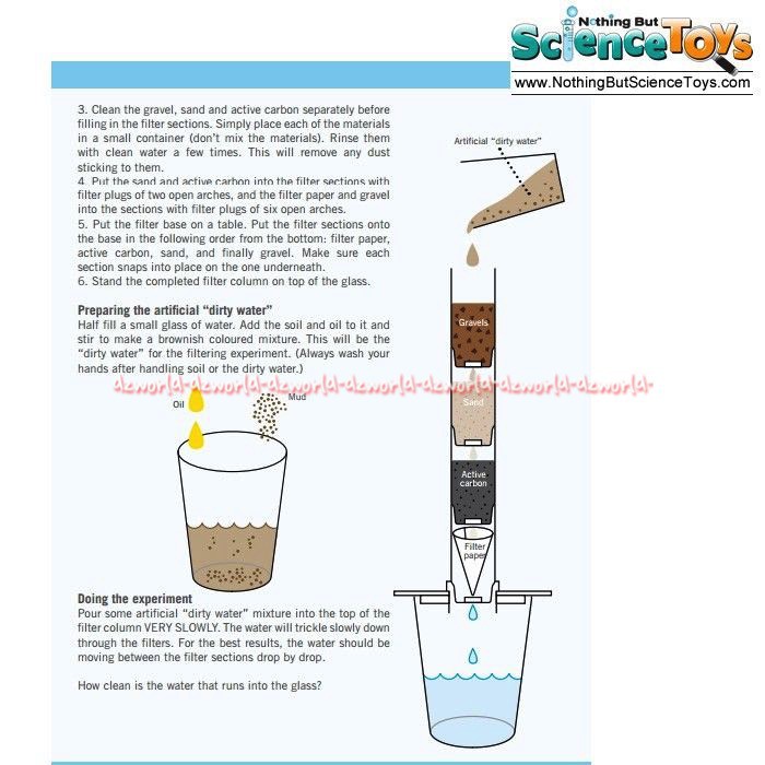 Alat desalinasi pribadi ini menunjukkan cara ilmiah untuk mengambil garam dari air laut. Pelajari ilmu membersihkan dan menggunakan kembali air kotor dengan melakukan percobaan pemurnian air yang menarik. Setiap kit berisi sistem filter plastik, karbon aktif, pasir, batu, kertas saring, dan instruksi. Cukup tambahkan gelas air. Buat proyek "Ilmu Hijau"