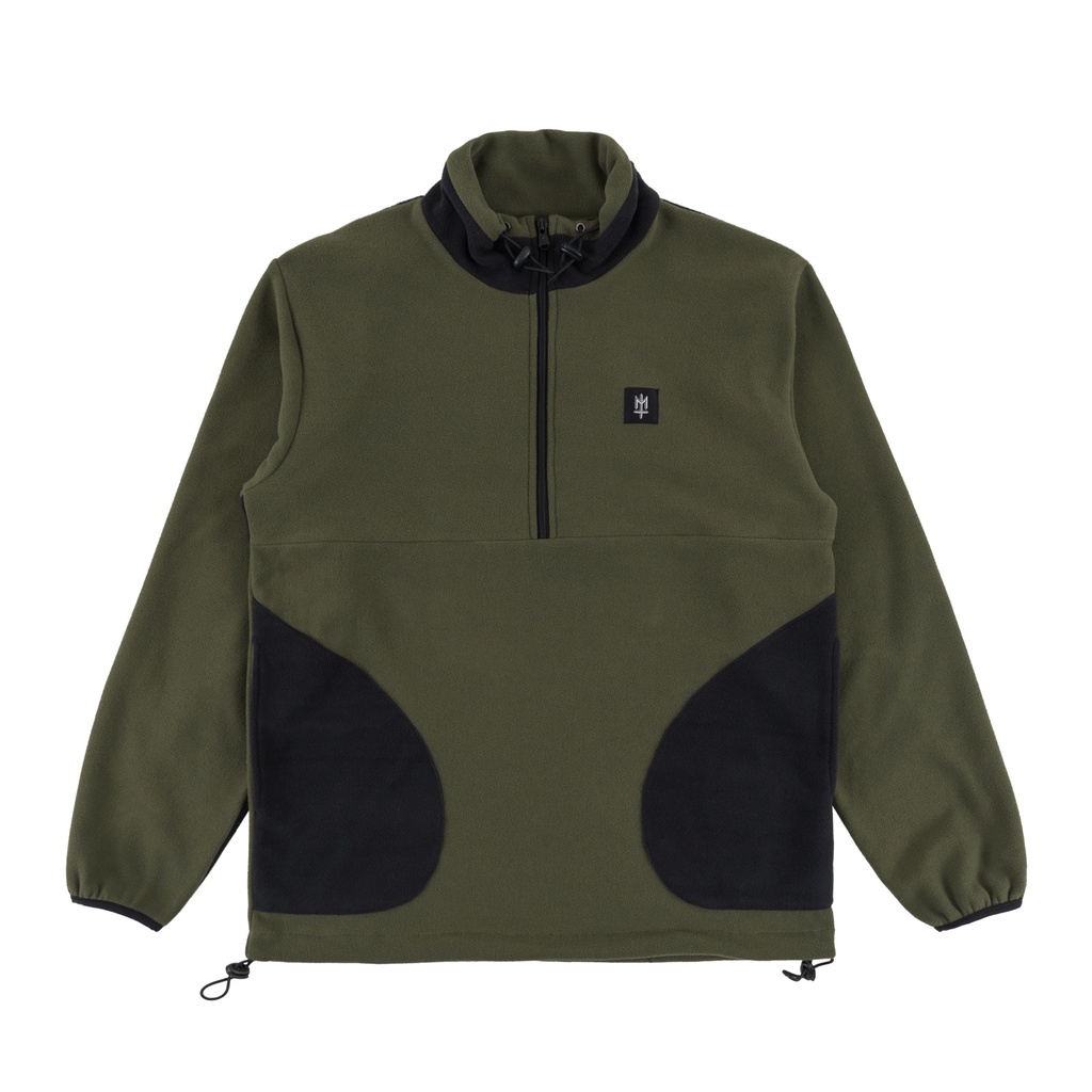Green and black polyester polar bomber jackets with black plastic zipper and woven patch.