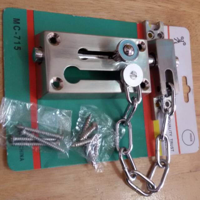 sekarang ready putih banyak, langsung order saja!!! Grendel rantai plat kotak berbahan stainless tebal dan bolt berbahan besi chrome. Grendel rantai berfungsi sebagai pengaman tambahan.