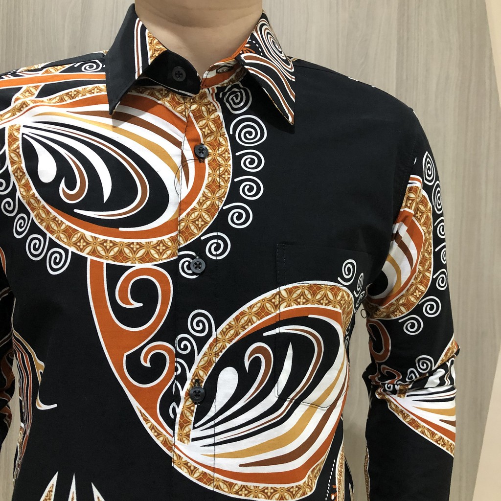 [GRIDLINE LS028 Black Orange & Navy Green] Kemeja Batik Pria Katun Lengan Panjang SlimFit