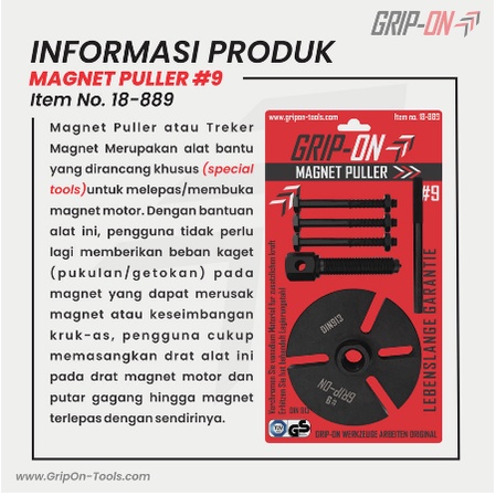 Deskripsi : Treker atau puller dikenal sebagai kunci khusus untuk mengendurkan atau mengencangkan momen dari sejumlah komponen kendaraan yang tidak dapat dijangkau dengan kunci biasa. Oleh karenanya tracker sengaja didesain khusus untuk kebutuhan spesial. Salah satu kegunaannya adalah untuk melepaskan bearing ataupun magnet dari dudukannya Fitur produk : • Terbuat dari bahan berkualitas tinggi tahan karat dan korosi • Cocok untuk industri otomotif dan peralatan bengkel motor • Terbuat dari logam berkualitas tinggi dan tahan lama, dapat digunakan untuk waktu yang lama. • Dengan desain yang ergonomis dan nyaman pada saat digunakan Highlight Produk : • Kualitas terjamin • Harga terjangkau • Cocok untuk industri otomotif dan peralatan bengkel motor Spesifikasi : Merk : GRIP-ON Model : 18-889 Type : MAGNET PULLER Ukuran grit : #9 Material : Carbon steel digunakan utk mencabut magnet berbagai jenis motor seperti : Honda : Vario Suzuki : Spin Yamaha : Crypton, Jupiter, Mio, Nouvo, Vega, Scorpio