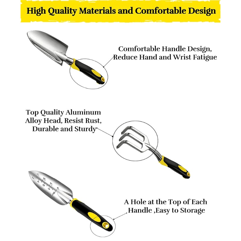 Alat Tangan Taman Set 3 Pcs Stainless Steel Gardening Kit Alat Penggaruk Tangan Alat Taman Fitur: baru dan berkualitas tinggi ●Set alat taman tiga potong: set alat tangan, termasuk sekop taman, penggaruk, sekop, dan set tradisional yang tahan lama. ●Cocok untuk berbagai tugas: termasuk pemangkasan, penggalian, penyiangan, kelonggaran, aerasi, transplantasi, dll. ●Penggemar berkebun: set alat berkebun tidak berat, tetapi sangat kokoh. Seri alat berkebun mengadopsi bahan paduan bermutu tinggi, yang secara efektif dapat menahan kondisi permukaan yang keras, dengan kekerasan tinggi, daya tahan, dan pembersihan yang mudah. ●Dirancang untuk berkebun: Alat berkebun tiga potong adalah per-sempurnaan. Sekop transplantasi dengan skala kedalaman yang jelas dan unit standar sangat cocok untuk mengukur kedalaman terbaik dan memiliki struktur yang lebih kuat. ●Pegangan yang nyaman: set alat taman tiga potong, ergonomis, pegangan lembut, terbuat dari bahan plastik berkualitas tinggi, yang dapat mengurangi tekanan pada pergelangan tangan dan tangan. Mengurangi rasa sakit tangan dan kelelahan selama menggali, menyiangi, menanam dan memotong.