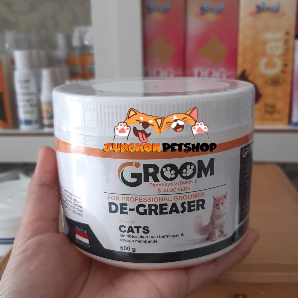GROOM DE-GREASER DI CIPTAKAN KHUSUS UNTUK MENGHILANGKAN LAPISAN BERMINYAK PADA BULU KUCING PELIHARAAN ANDA. LAPISAN MINYAK INI MERUPAKAN SEKRET YANG DIKELUARKAN AKIBAT PERUBAHAN HORMON PADA KUCING JANTAN ATAU BETINA. LAPISAN MINYAK TERSEBUT BIASA KITA TEMUI PADA BAGIAN PANGKAL EKOR, LIPATAN PAHA, DAGU, SEKITAR TELINGA DAN BAGIAN DADA..