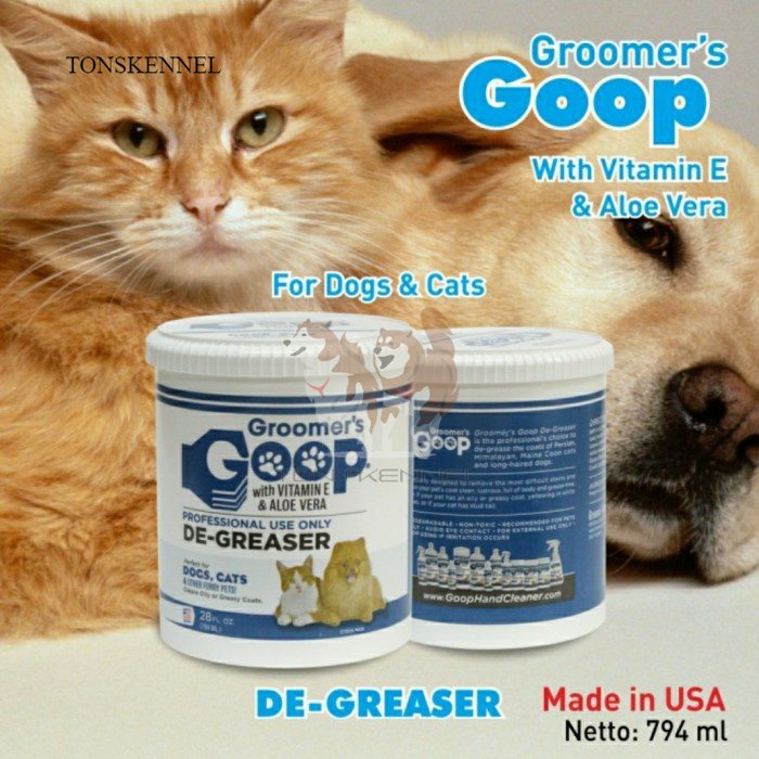 Groomer's Goop dirancang khusus untuk menghilangkan minyak, lemak, getah, noda, bau pada anjing dan kucing yang berbulu panjang seperti Persia, Himalaya dan Maine Coon. Ini adalah jawaban untuk hewan peliharaan Anda yang bulunya mengalami masalah kelebihan minyak. Tidak-beracun, biodegradable (terurai), diperkaya dengan formula yang mengandung gliserin, lanolin, vitamin E dan Aloe Vera untuk pengkondisian kulit. Juga bagus untuk membersihkan dan memutihkan cakar dan area kemaluan Tidak ada yang bekerja lebih baik untuk menghilangkan lemak dan minyak pada bulu hewan peliharaan Anda. Rumus Groomer's Goop ini dirancang khusus untuk menghilangkan kotoran dan bau yang paling bandel dan meninggalkan bulu hewan peliharaan Anda tampak lebih bersih, berkilau dan bebas lemak.. Aman dipakai pada anakan anjing dan kucing. Made in USA Goop groomer adalah reformulasi yang disempurnakan dari Original Goop Multi-Purpose Hand Cleaner yang banyak dipakai oleh para ahli show, groomers, peternak, dan dokter hewan selama bertahun-tahun. Cara penggunaan Groomer's Goop : 1. Gosokkan sejumlah Groomer's Goop ke dalam bulu kering hewan peliharaan. Pastikan untuk memijat Groomer's Goop sampai menyerap ke dalam bulu, kepala sampai kaki, daerah kemaluan, belakang telinga dan pada area bulu menggumpal. 2. Biarkan sekitar 5-10 menit agar produk dapat menembus dan menghilangkan minyak yang berlebih pada bulu. Kemudian tambahkan sedikit air dan gosok menjadi busa. Bilas sepenuhnya dengan air hangat. Untuk hasil terbaik gunakan Sampo Groomer's Goop 3. Keringkan dengan handuk atau pengering.