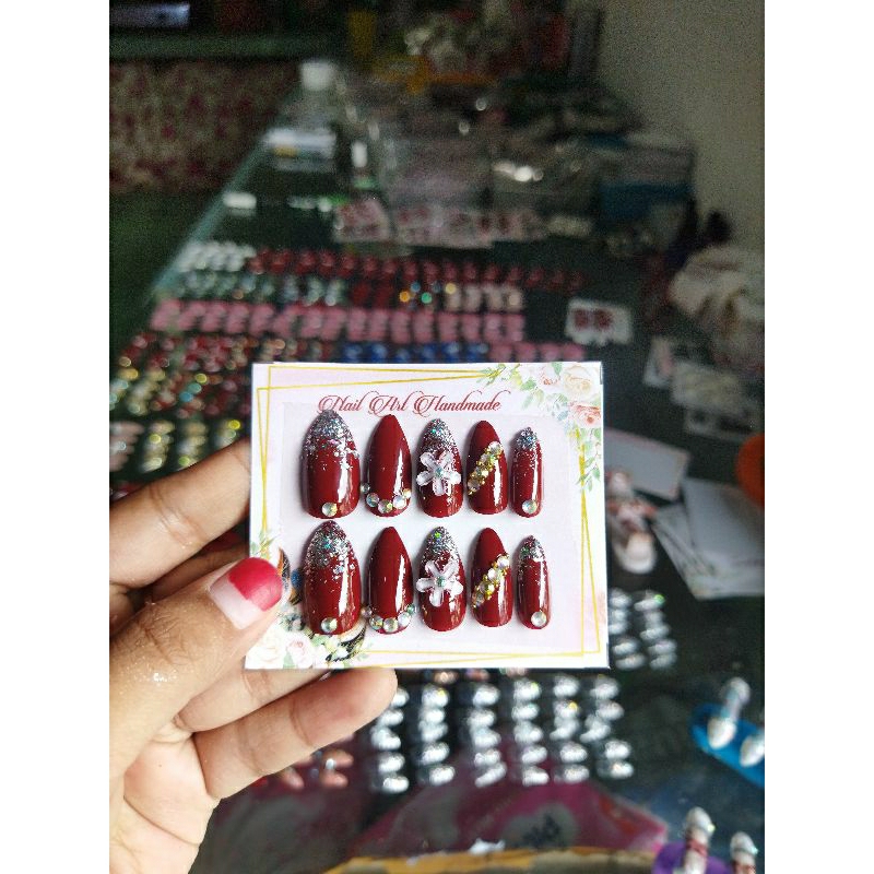 yukk yg mau kuku palsu grosirnya kak.. asli hematttt bangett sudah lengkap dgn lemnya semua harga murah kwalitas gak murahan bisa riques warna tersedia warna.maron.merah cabe putih. hitam.navy. bata.nude. minta motif yg beda2 juga bisa kak khusus motif simpel🥰 tapi ttp elegan dan mewahh tentunya DI KiRIM motif random tapi tentunya kece2 motifnya. pastinya cantiik2😘