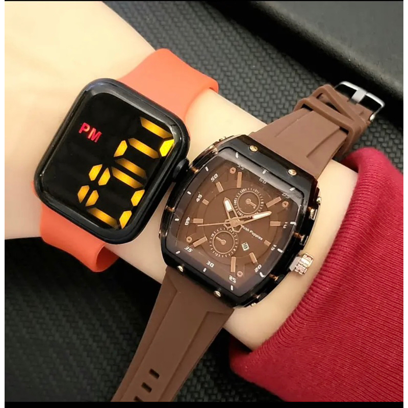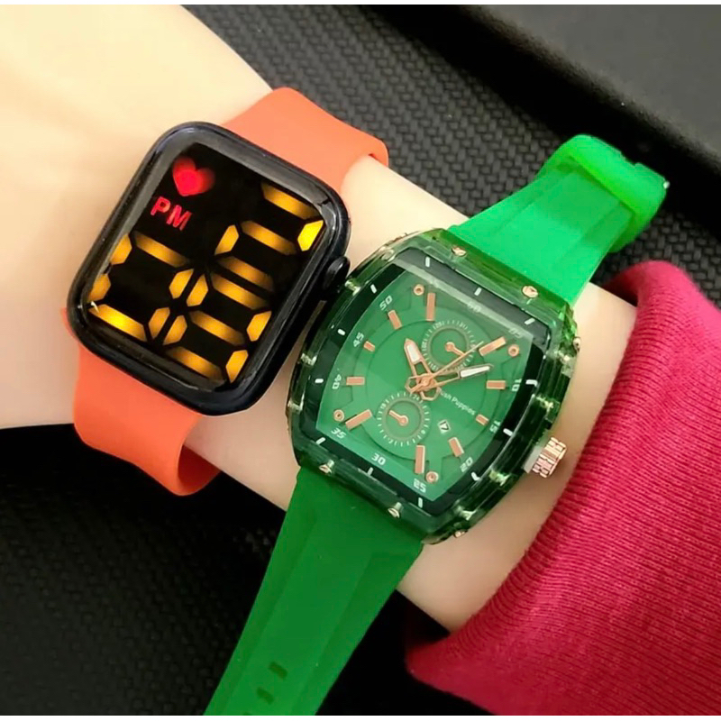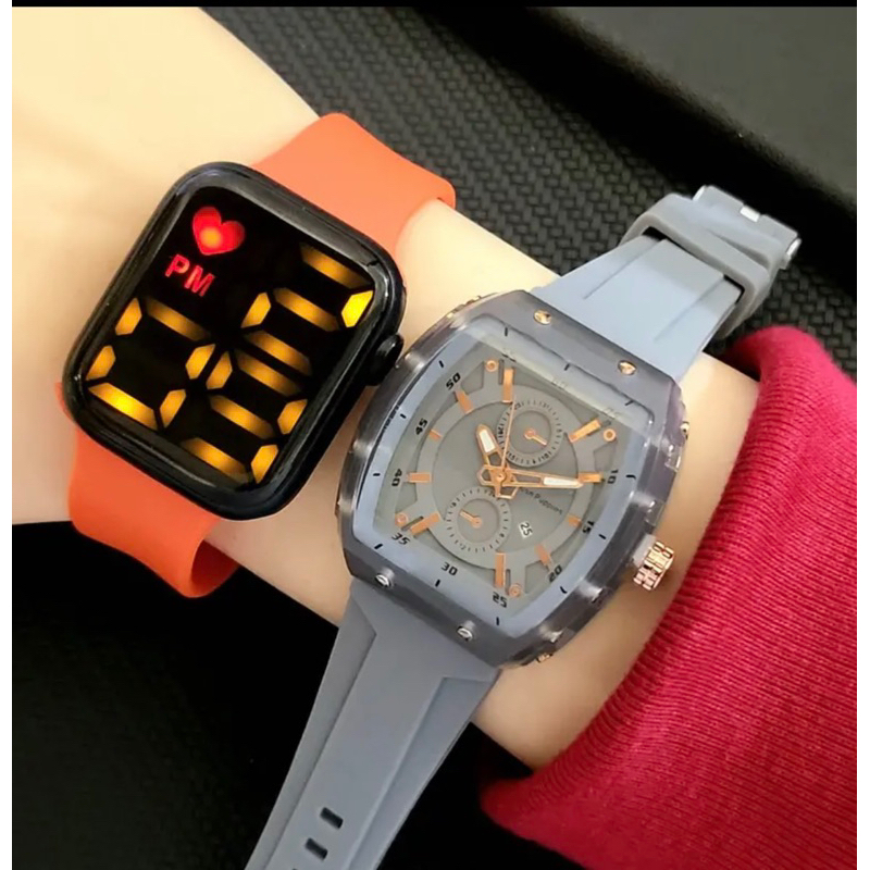 (Grosir Cod)Jam Tangan wanita Buy1/Get1 Led Kuning+Hp Casual Tanggal Aktif Strap Rubber/Karet(Dikirim Jakarta)