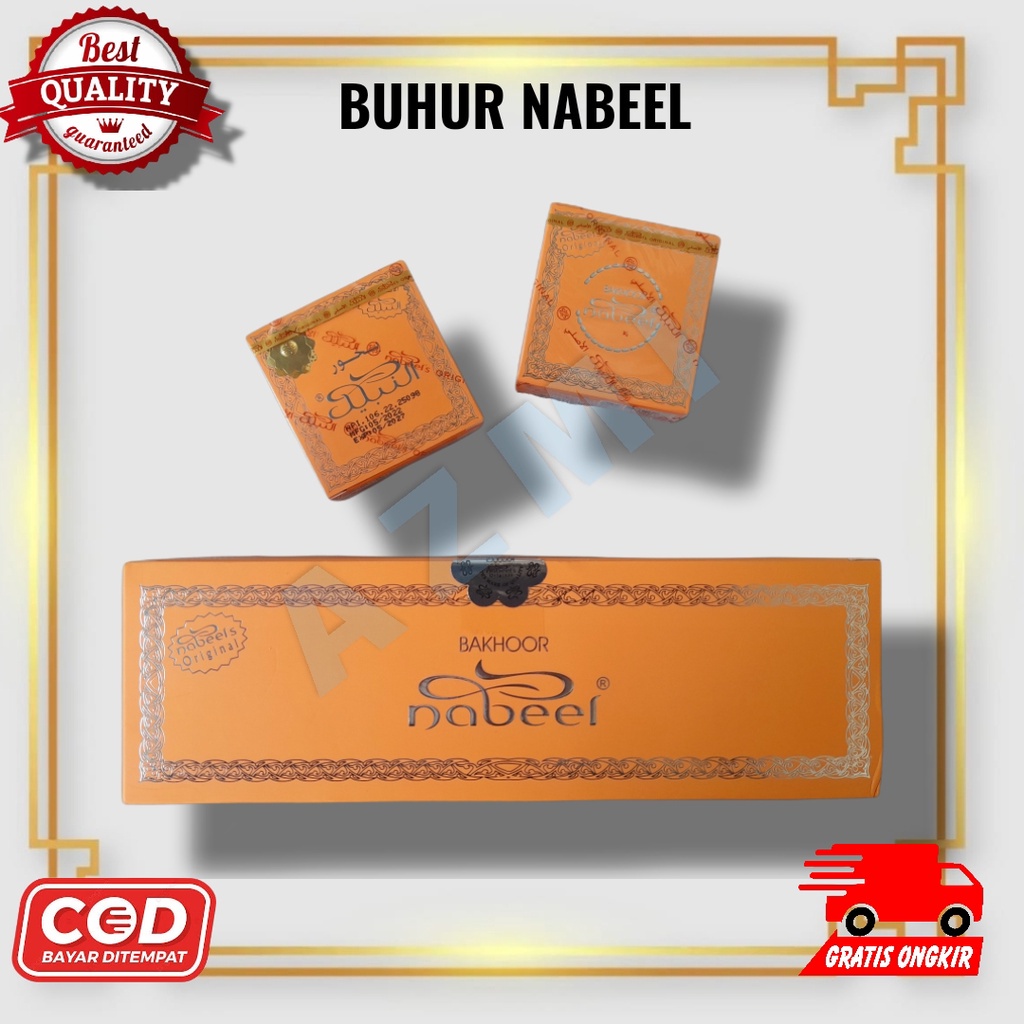 Bukhur Nabeel :Salah satu bukhur yang sangat populer di Timur Tengah.Wewangian kayu oriental, terbuat dari minyak wangi alami dan organik rempah-rempah, Aroma fresh segar khas Nabeel dan tahan lama. Cara pemakaian : Wewangian dupa arab dibakar di atas arang, Fungsi : Biasa digunakan dalam acara acara keagamaan, majlis majlis taklim, pernikahan hajatan khitan dll. Dipakai untuk mengharumkan rumah, kamar, kantor, acara keagamaan, pernikahan_x000D_