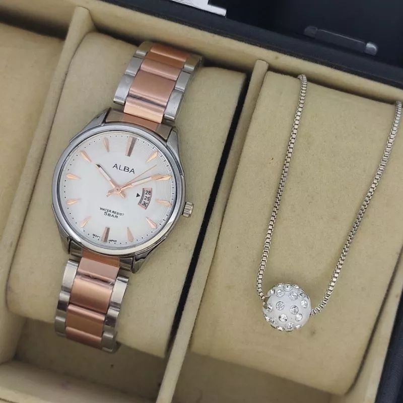 Spesifikasi : - Type : Jam tangan wanita - Brand : Alba - Tali : Rantai - Tanggal : Aktif - Diameter : 2,5cm - Mesin : baterai