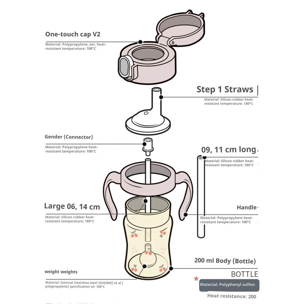 Detail produk : - Terdapat design buah cherry pada bagian botol. - Straw Cup Grosmimi memiliki bahan dasar PPSU yang merupakan bahan dasar plastik dengan kualitas tertinggi bila dibandingkan dengan jenis material plastik lainnya. - Silikon sedotan yang digunakan terbuat dari medical grade silicone yang biasa digunakan di rumah sakit-rumah sakit di Korea. - Terdiri dari 1 botol PPSU, ring, pemberat, dan One Touch Cap. - Microwaveable. - Disarankan untuk mulai digunakan pada usia 6 bulan ke atas. - Ujung sedotan berbentuk '+ cut' sehingga apabila dibalikkan tidak akan bocor. - Dapat digunakan 2 cara; sambil duduk atau sambal berbaring - Aliran arus balik dapat dicegah karena ada katup udara.