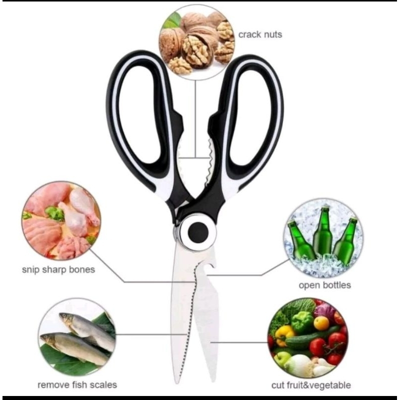 - Nama Produk : gunting dapur multifuntional - Bahan : Stainless Steel, Plastik - Warna : hitam dan silver - ukuran : 20.5x9.1 cm