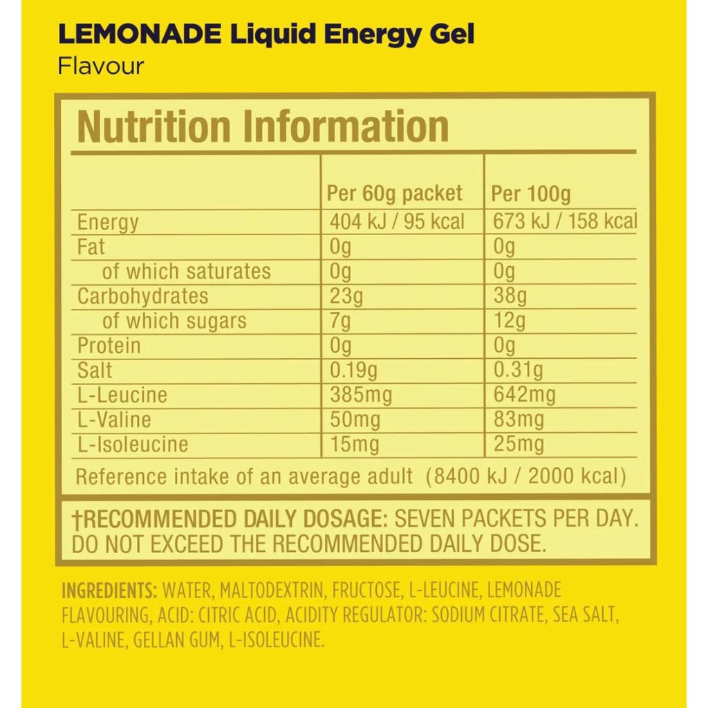 Liquid Energy delivers 100 calories and essential electrolytes to help athletes perform their best in a portable and refreshingly light liquid form Dual source energy from maltodextrin and fructose that use non-competing pathways for efficient absorption and lasting energy Use for training or racing; take one packet 5 minutes before and every 45 minutes during activity Branched-chain amino acids to help decrease muscle damage and mental fatigue Lemonade is Caffeine Free, and contains 75mg Sodium, 450mg Amino Acids, 23g Carbohydrates