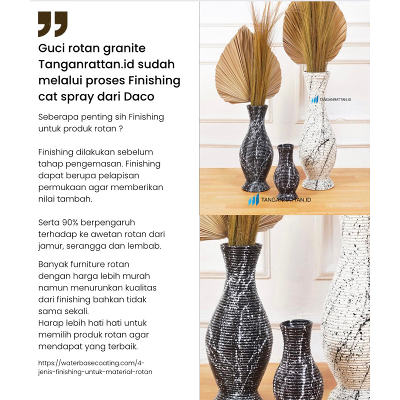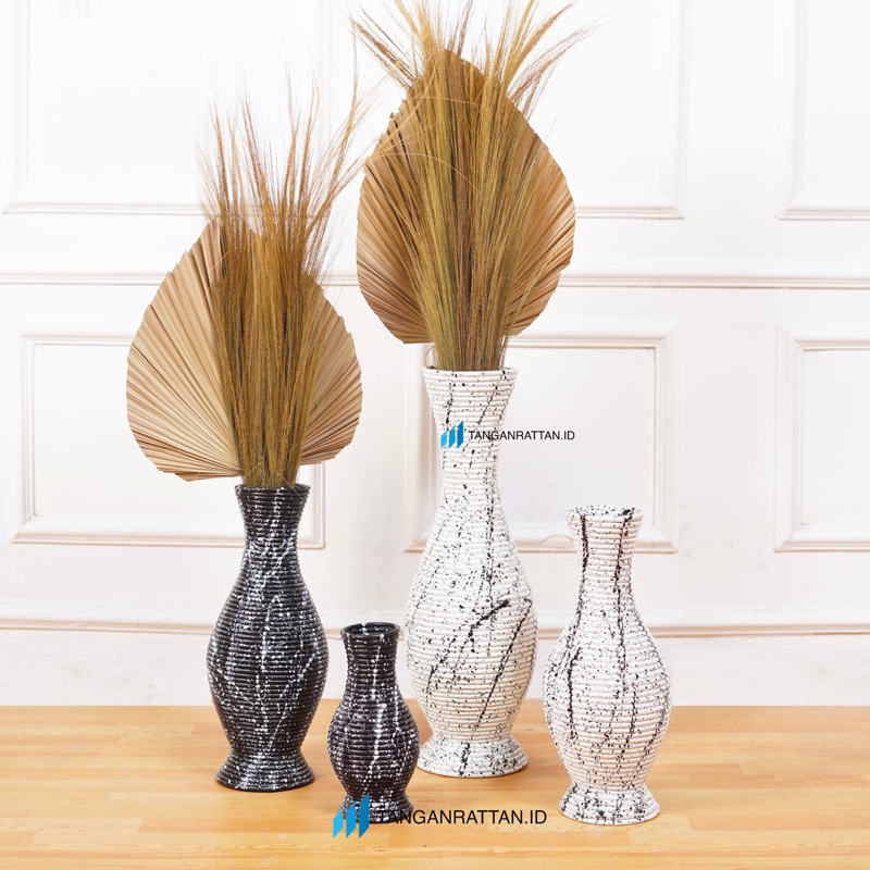 merupakan vas besar dengan bentuk seperti guci, namun terbuat dari material rotan asli. Sudah melalui proses pewarnaan putih dan hitam dengan alur granit abstrak membuat kesan lebih mewah dan elegant. Sangat cocok untuk properti foto dan dekorasi ruangan.