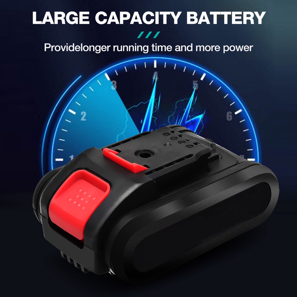 Battery Capacity Battery: 21V Charging Voltage: 110-220V Charging Time: 2h Working Time: 60-80 menit Dimension Length: Approx. 29 cm Others Material: PVC, Metal Peak Power: 600W Rated Power: 450W Max Cutting: 30mm
