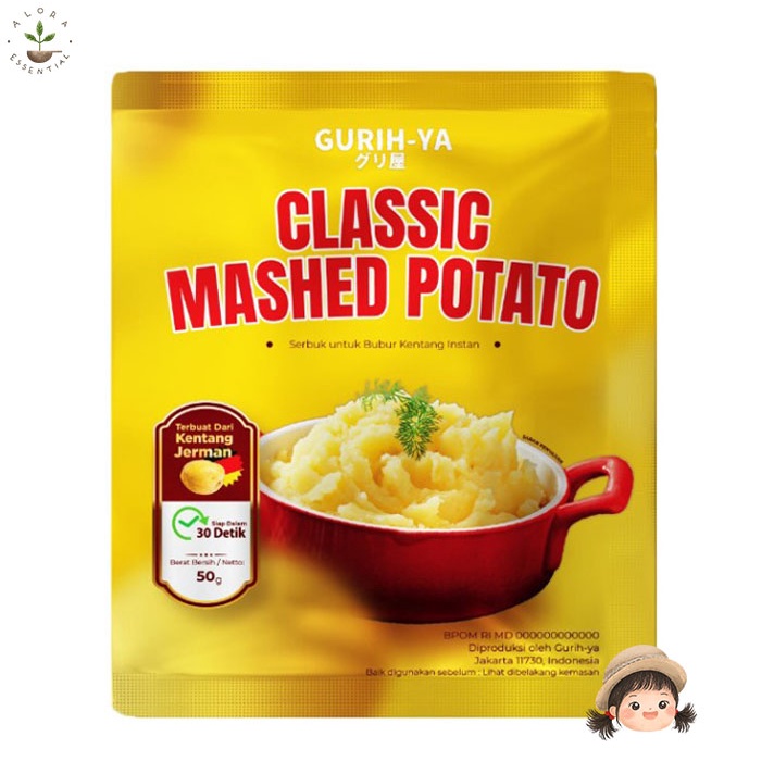 Mashed Potato kami terbuat dari kentang premium dari Jerman, dan tanpa garam & tanpa pemanis, tanpa MSG dan tanpa pengawet. Sangat mudah dibuat. Cukup tambahkan air, aduk dan Anda bisa memakannya segera! Anda dapat menambahkan lebih banyak rasa pada Mashed Potato Anda dengan menambahkan bumbu favorit Anda seperti mentega, garam, peterseli, potongan bacon, dan lain-lain untuk membuat Mashed Potato sesuai dengan keinginan Anda.