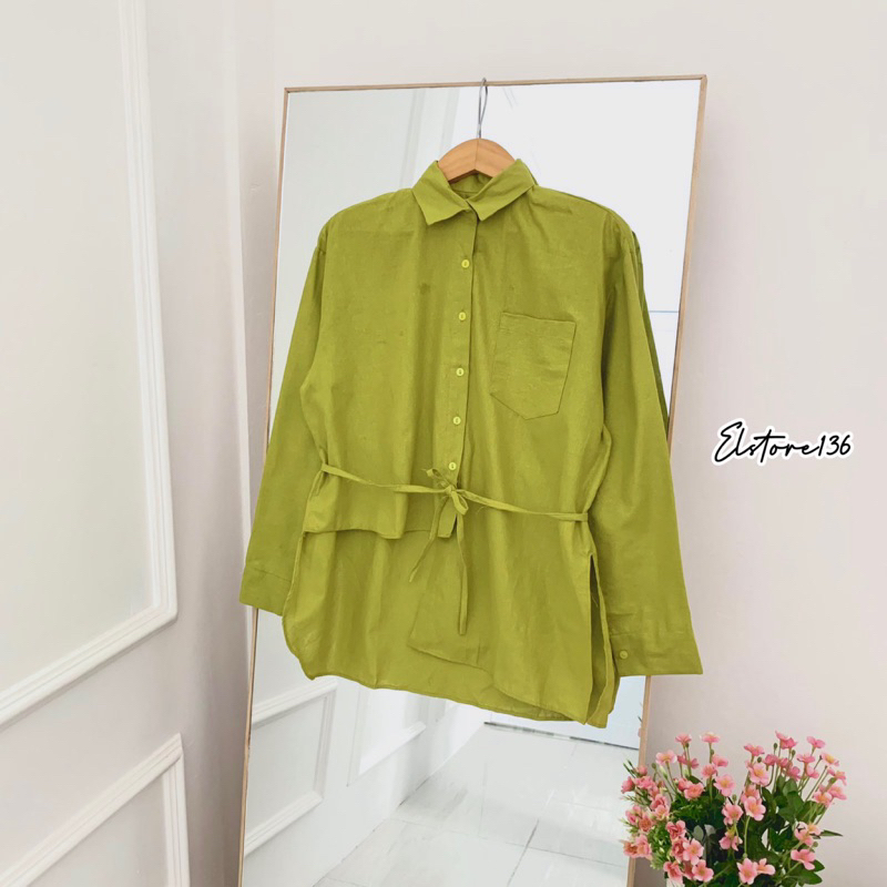 Detail Kemeja Oversize Linen Gyaa Blouse Atasan Wanita Lengan Panjang Full Kancing Free Belt Fashion Remaja Terbaru