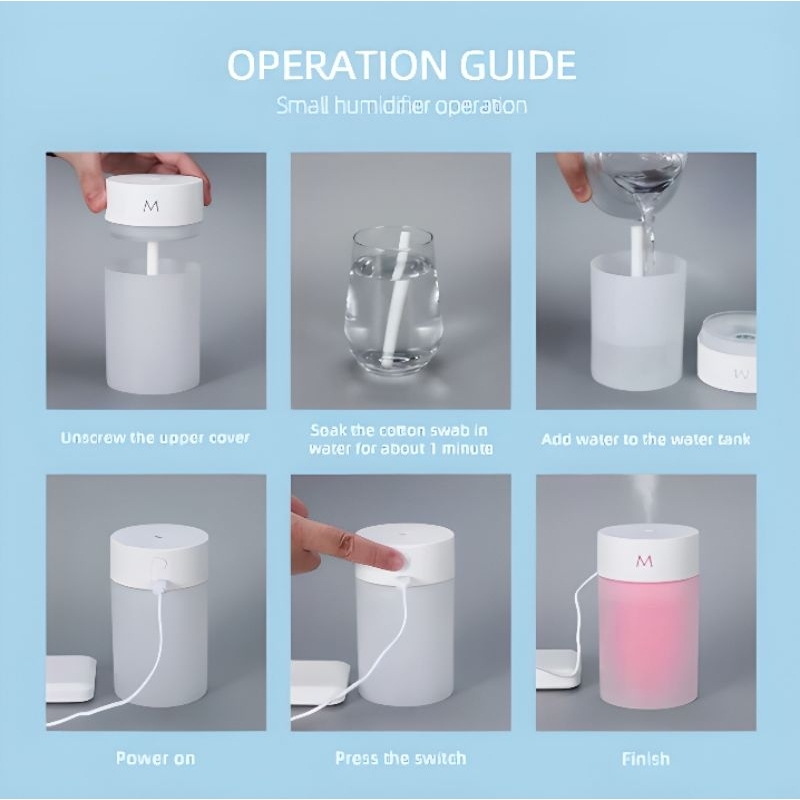 Kelebihan Humidifier : 1. Pelembab Udara Alat ini berfungsi seperti humidifier pada umumnya yang mampu mengeluarkan uap air dari air yang ditaruh pada tanki di bawahnya. Anda juga bisa mencampurkannya dengan beberapa tetes aromaterapi agar uap yang dihasilkan jadi lebih wangi. 2. Lampu Tidur Terdapat LED pada humidifier ini, sehingga dapat Anda jadikan sebagai lampu tidur. Dilengkapi dengan 7 cahaya ambient warna hangat, cahaya warna dapat diubah dengan bebas. 3. 260 ml Humidifier ini dapat menampung air sebanyak 260 ml. Dengan kapasitas ini, Anda dapat menggunakan pelembab udara ini selama 4 hingga 8 jam. 4. Material Berkualitas Terbuat dari bahan ABS berkualitas yang ringan namun kokoh sehingga awet untuk penggunaan jangka panjang. 5. Kedap Suara Luapan tidak menetes dan kedap udara. Humidifikasi senyap tidak memengaruhi tidur