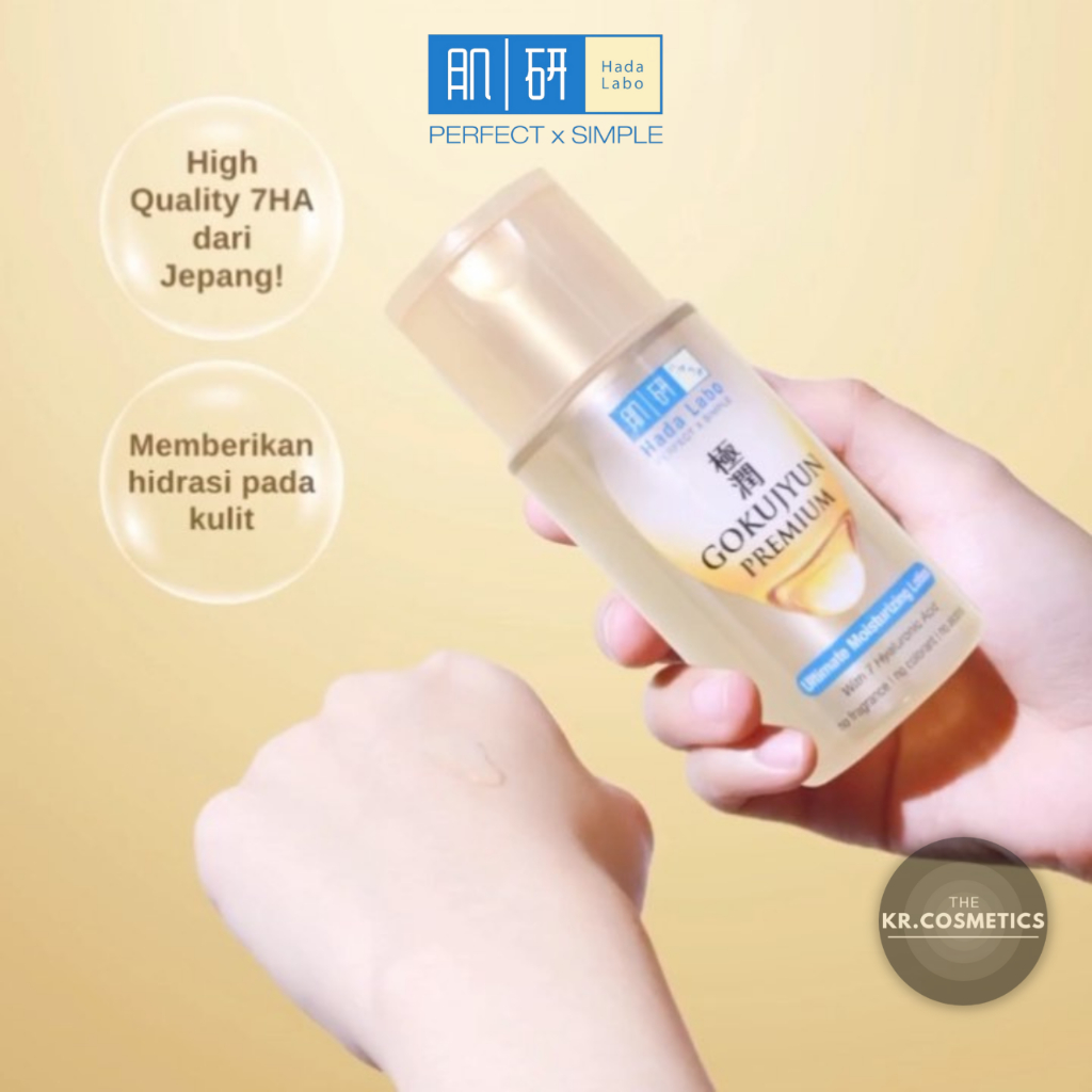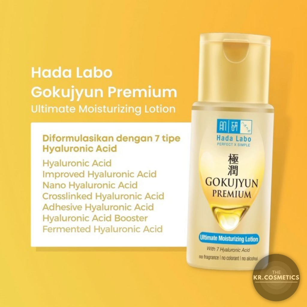 Hada Labo Gokujyun Premium Ultimate Moisturizing Lotion dengan 5 Tipe Hyaluronic Acid (pelembab) : 1. Hyaluronic Acid (HA) : mampu meningkatkan hidrasi kulit, dan menjaga elastisitas kulit. 2. Improved HA (AcHA) : mampu meningkatkan hidrasi kulit lebih tinggi dibandinh HA biasa. 3. Nano-sized HA : meresap hingga bagian epidermis terdalam. 4. Encapsulated HA : Encapsulated Hyaluronic Acid, sehingga mampu bertahan lama. 5. Adhesive HA : Hyaluronat yang dimodifikasi sehingga lebih melekat pada kulit.