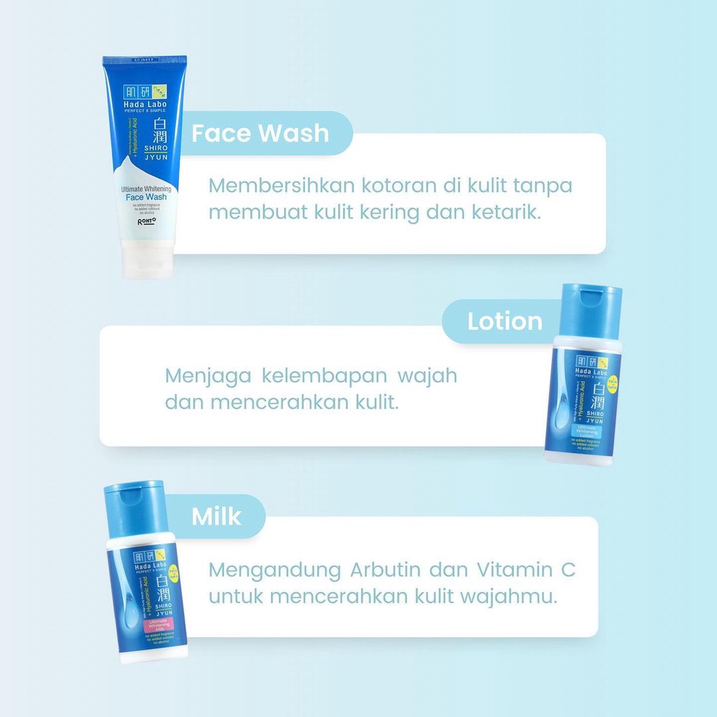 Bersihkan wajah menggunakan Hada Labo Shrojyon Ultimate Whitening Face Wash, tuangkan secukupnya pada telapak tangan. Usapkan ke seluruh wajah secara merata, bilas hingga bersih. Gunakan Hada Labo Shrojyon Ultimate Whitening Lotion pada wajah yang telah dibersihkan, tuangkan secukupnya pada telapak tangan, usapkan ke seluruh wajah secara merata, tepuk-tepuk halus hingga meresap Gunakan Hada Labo Shrojyon Ultimate Whitening Milk setelah Whitening Lotion. Ambil secukupnya di telapak tangan lalu usapkan secara merata di seluruh wajah. Biarkan hingga meresap.
