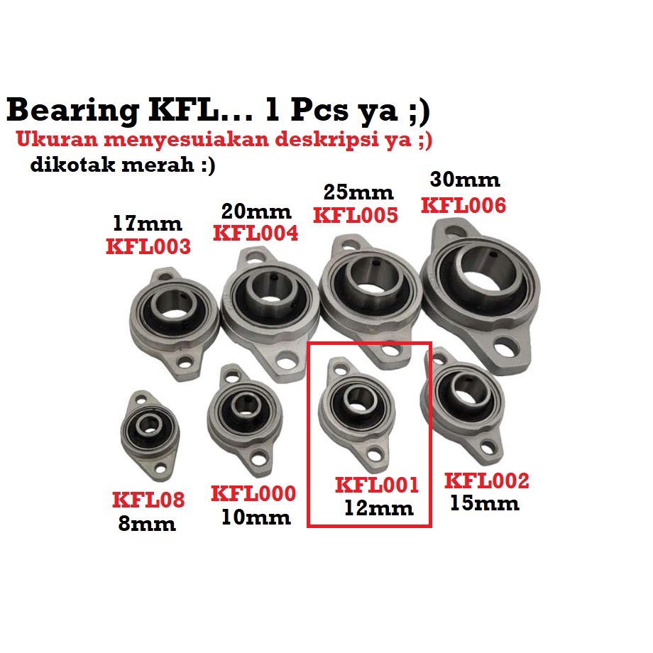 ++ Spesifikasi Produk : - Nama : Bearing Block KFL001 - Diameter dalam : 12mm - Diameter baut penguat : 6mm (M6) - Kunci L yang cocok : 2mm - Posisi : Horizontal - Bahan : Zinc Seng Alloy - DLL. Cek foto deskripsi ya :)