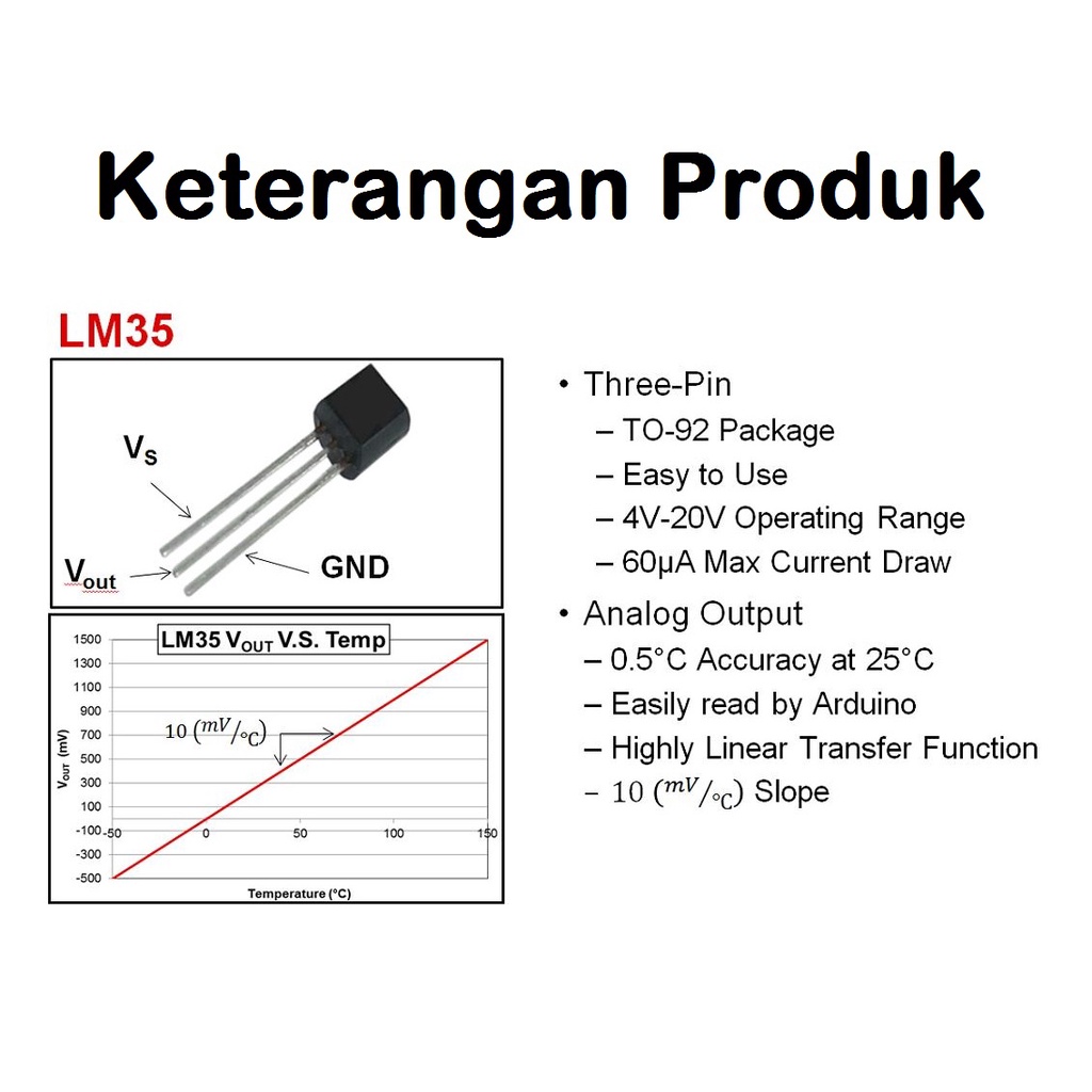 ++ Spesifikasi produk : - Nama : Sensor Suhu LM35 - Ukuran : Transistor TO 92 - Akurasi : ± 0.5°C - Range pembacaan : -55 - 150°C - Tegangan Kerja : 4-30V, 5V disarankan - Arus kerja : kurang dari 60 uA - Output : +10mV tiap derajat Celcius - DLL. Cek foto deskripsi ya ;)