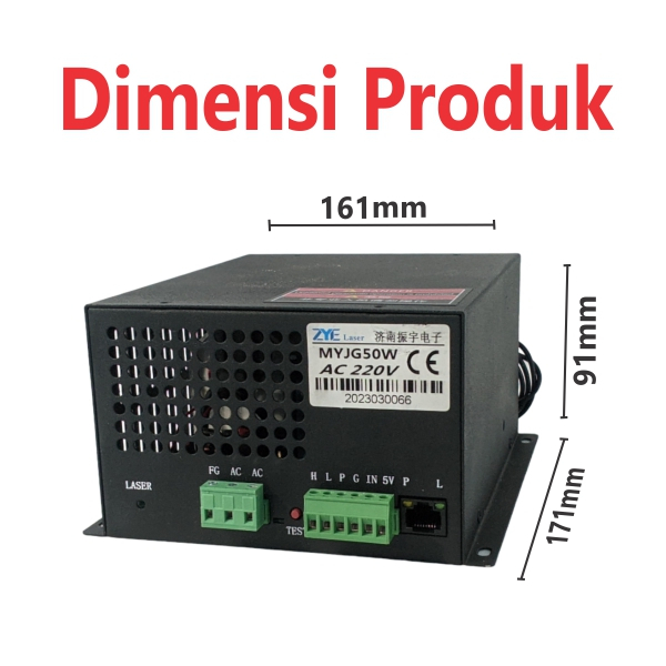 ++ Spesifikasi produk : - Nama : Power Supply Laser CO2 - Seri : MYJG - Dimensi : 171x161x91 (L*W*H)(mm) - Input Sinyal : 5V - Daya : 50 Watt - Input : 110/220V AC (bisa disetting) - Efisiensi : >=91% (full beban) - MTBF : >= 30000 Jam - Lingkungan kerja : -10~50 - DLL. Untuk lebih detailnya Cek foto deskripsi ya ;)