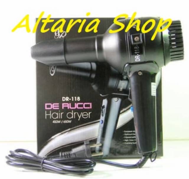 HAIR DRYER DE RUCCI DR-118 : ● Turbo dry dengan panas dan angin yang optimal ● Terdapat 2 pengaturan kecepatan I : suhu panas sedang II : suhu panas maksimal 0 : berhenti ● Terdapat Cool Shot Button (warna biru) untuk fungsi angin biasa ● Desain yang bagus dan motor yang awet