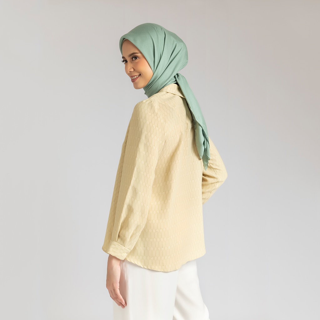 Kemeja berkerah yang menggunakan bahan krep halus. Menampilkan detail kerut di leher, ujung lengan yang dapat disesuaikan, dan lengan berlipit.