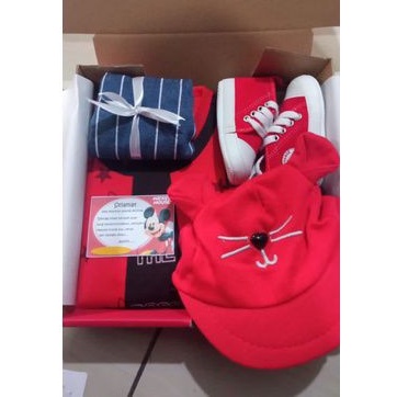 1 box berisi ~ setelan baju laki" Sni ~ topi ~ sepatu ~ free kartu ucapan ~pita ~box