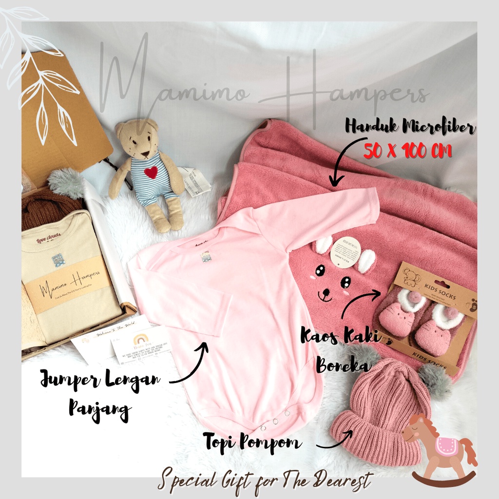 Isi Hampers : - Jumper atau Jumpsuit Polos Lengan Panjang usia 6-12 BULAN - Kaos Kaki Boneka - Handuk Microfiber Uk. 50 x 100 cm - Topi Rajut Pompom