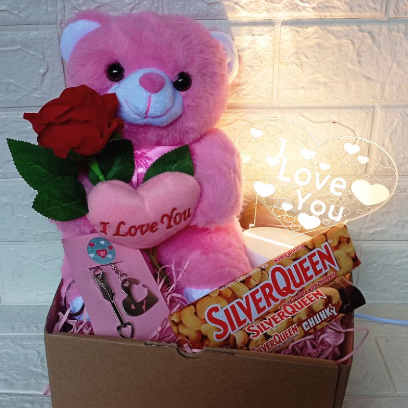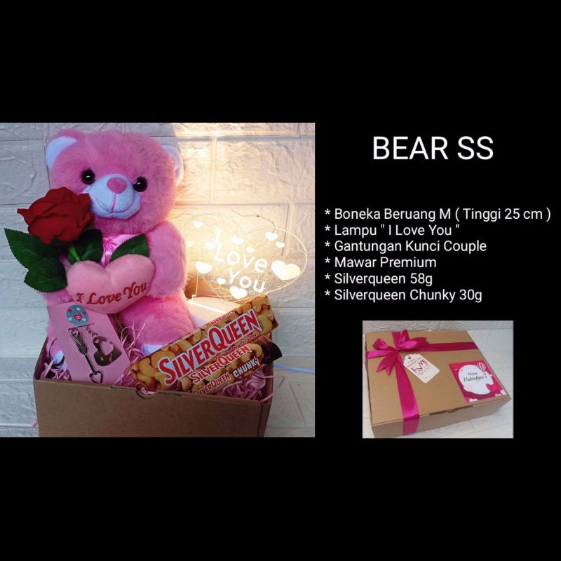 Dalam Paket Komplit Bear SS kamu akan dapatkan : * Boneka Bear M ( Tinggi 25 cm posisi duduk ) * Lampu Tidur " I Love You " * Gantungan Kunci Couple * Bunga Mawar Artificial Premium * Silverqueen 58g * Silverqueen Chunky 30g