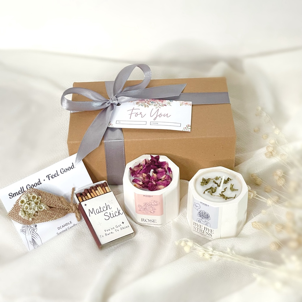 Isi gift box: 1. Scented Candle Concrete + bunga kering (isi 2pcs) bebas pilih aroma 2. 1pcs Korek Api Kayu 3. 1pcs Greeting Card 4. 1pcs Greeting Card Bucket