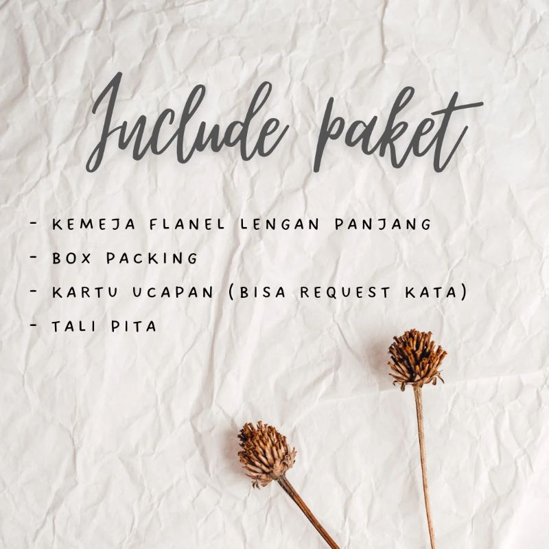- Kemeja Flanel (Bisa pilih motif dan ukuran) - Box Pembungkus - Kartu ucapan (bisa request) Tulis di catatan. - Tali Pita untuk box
