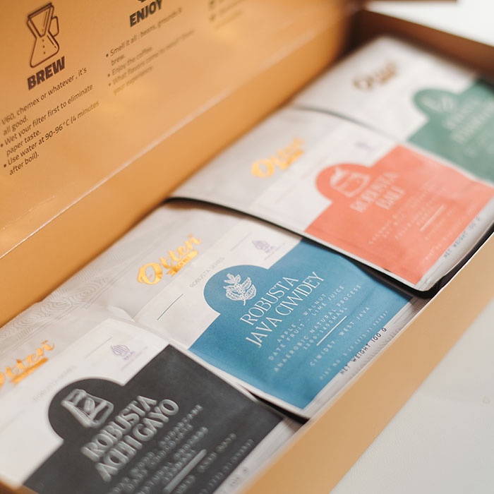 * Kopi Robusta Temanggung 100g berasal dari kabupaten Temanggung, provinsi Jawa Tengah. Memiliki potensi rasa yang bisa Anda dapatkan antara lain, rock sugar, chocolate, walnu, dan palmyra fruit. * Kopi Robusta Bali 100g berasal dari desa Pucaksari, kecamatan Busungbiu, Kabupaten Buleleng, provinsi Bali. Potensi rasa yang Anda dapatkan ketika menyeduhnya antara lain, coconut biscuits, soy milk, vanilla, dan sugar cane. * Kopi Robusta Aceh Gayo 100g berasal dari gampong Arul Kumer, kecamatan silih nara, kabupaten Aceh Tengah. Temukan potensi rasa tiap kali Anda menyeduhnya, antara lain Cedar Wood, Dark Chocolate dan Sugar Cane. * Kopi Fine Robusta Java Ciwidey 100g adalah robusta yang melalui proses grading dari R Grader, berasal dari kecamatan Ciwidey, kabupaten Bandung, provinsi Jawa Barat. Rasakan bagaimana potensi rasa yang terekstraksi ketika penyeduhan antara lain, apple, walnut, dates dan lime juice.