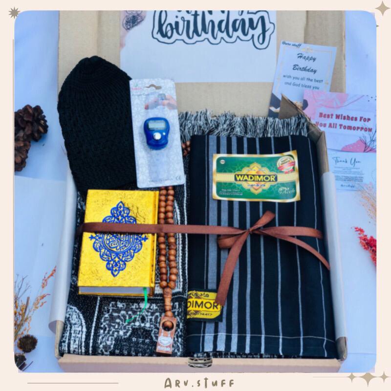 🔺READY STOCK🔺 𝓖𝓲𝓯𝓽 𝓑𝓸𝔁 𝓐𝓵𝓺𝓾𝓻𝓪𝓷 #1 • Sarung Wadimor • Sajadah Turki Tenun 52x100cm • Alquran Saku • Peci Rajut • Tasbih Digital GRATIS: Tasbih 99 biji, kartu ucapan req, background acara (ultah/LDR/dll), thanks card, fighting card, hiasan box (stiker hiasan & tali pita)