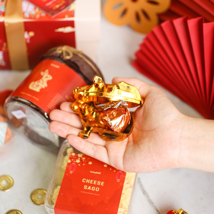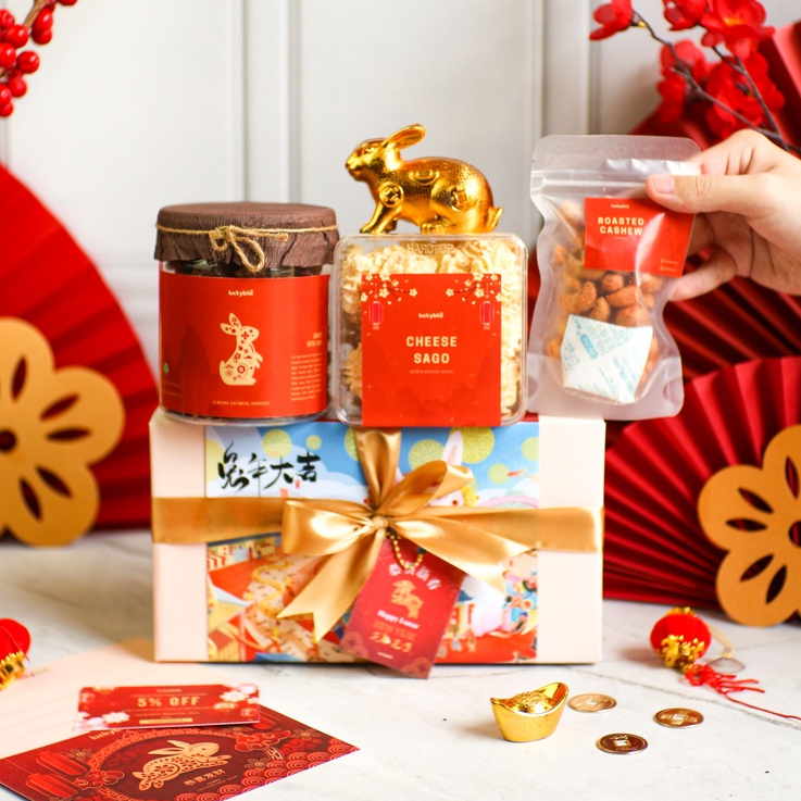 Video perkenalan produk Hampers Imlek / CNY Hampers - Semi Hardbox - Sagu Keju + Oatmeal Cookies + Kacang Mede + Miniatur Kelinci + FREE KARTU + PITA + VOUCHER + BUBBLE WRAP | LUCKYBITE. Sumber: Shopee.