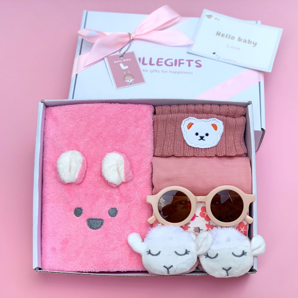 Isi Hampers + Kacamata (95RB): - 1 pcs Jumpsuit / Jumper 100% Katun Bayi - 1 pcs Slabber / Bib / Celemek Bayi Motif - 1 pcs Topi Rajut Motif Boneka - 1 pasang Kaos Kaki Boneka (memiliki anti-slip sehingga tidak licin) - 1 pcs Kacamata Bayi - Corrugated Box Putih ukuran 25x20 - Kartu Ucapan Printed & Custom (bisa request isi kartu ucapan via catatan saat pemesanan atau via chat) - Hiasan Pita & Custom Hangtag Initial Baby - Bungkus Bubblewrap + Kardus Pengaman