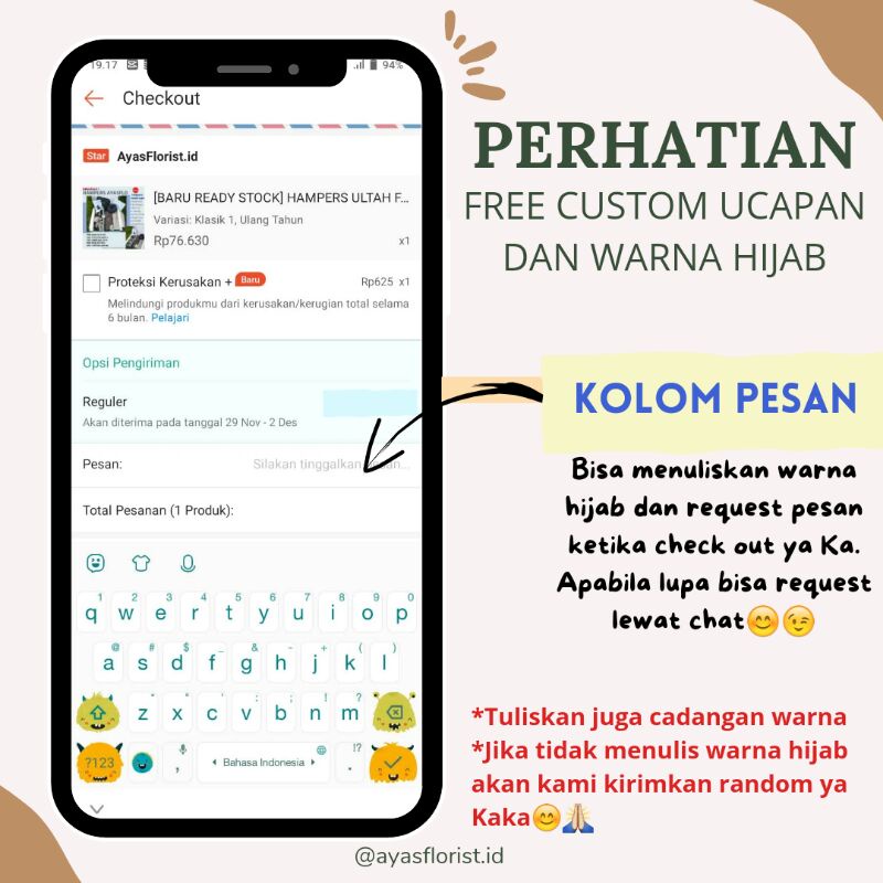 Mau Pesan dalam jumlah banyak? Bisa kak😊, Chat dulu yaa, minimal order 5 akan kami kasih cashback shopeepay Mau Jadi Reseller/ Dropshipper? Bisa banget Ka😍, chat kami nanti kirimkan foto produk dan price listnya kaka WAJIB ISI DI NOTE/ CHAT ADMIN, APABILA TIDAK DIISI AKAN DIKIRIM WARNA RANDOM DAN GIFT CARD KOSONGAN - Warna Hijab : --Gift Card-- Dear/ Untuk : Pesan : From : THANK YOU FOR TRUSTING US 😊🙏 Hampers gratis foto polaroid kaka, mohon setelah checout segera dikrimkan fotonya kaka