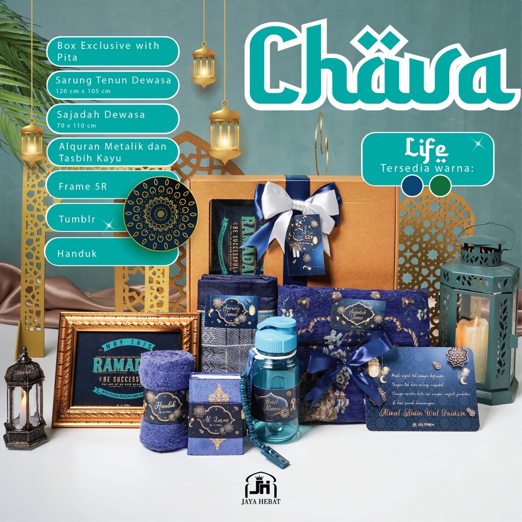 Chava : Live Living with competent, practical and often obtain great power and wealth. Told to be successful in business and able to achieve great dreams. - Sajadah Dewasa 70cm x 110cm - Sarung Tenun Dewasa 120cm x105cm - Handuk Premium 34cm x 80cm - Botol Minum Kualitas Premium - Frame foto ukuran 5R - Alquran Metalik Saku 10cm x 7.5cm - Tasbih Kayu 33 - 8mm - Kartu Ucapan - Box Exclusive, Design Idul Fitri, Pita