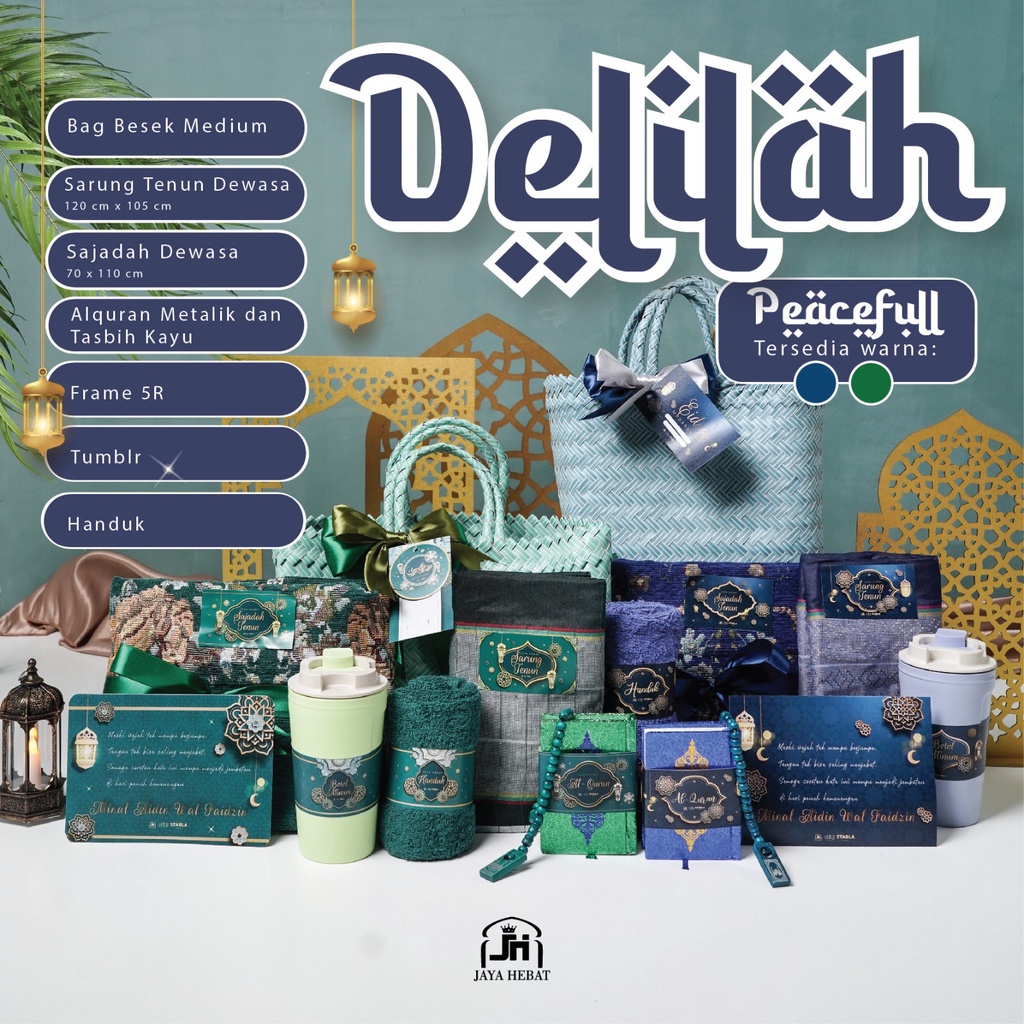 Delilah : Peaceful - Sarung Tenun Dewasa 120cm x105cm - Sajadah Dewasa 70cm x 110cm - Tasbih Kayu 33-8mm - Alquran Metalik Saku 10cm x 7.5cm - Handuk Premium 34cm x 80cm - Botol Minum Kualitas Premium - Tas Cantik - Kartu Ucapan - Keranjang, Design Idul Fitri, Pita