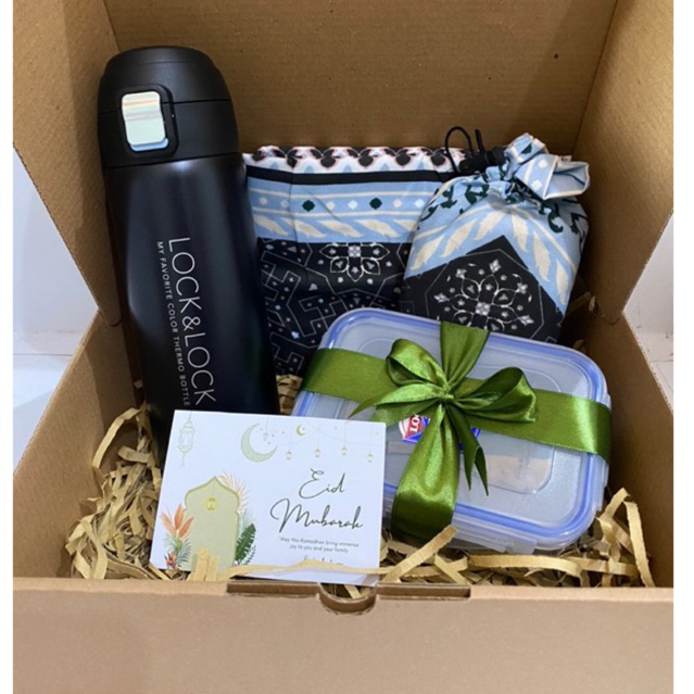 - Paket Hampers A: LED tumbler hitam + Sajadah Travel + premium assorted candy + kartu ucapan lebaran