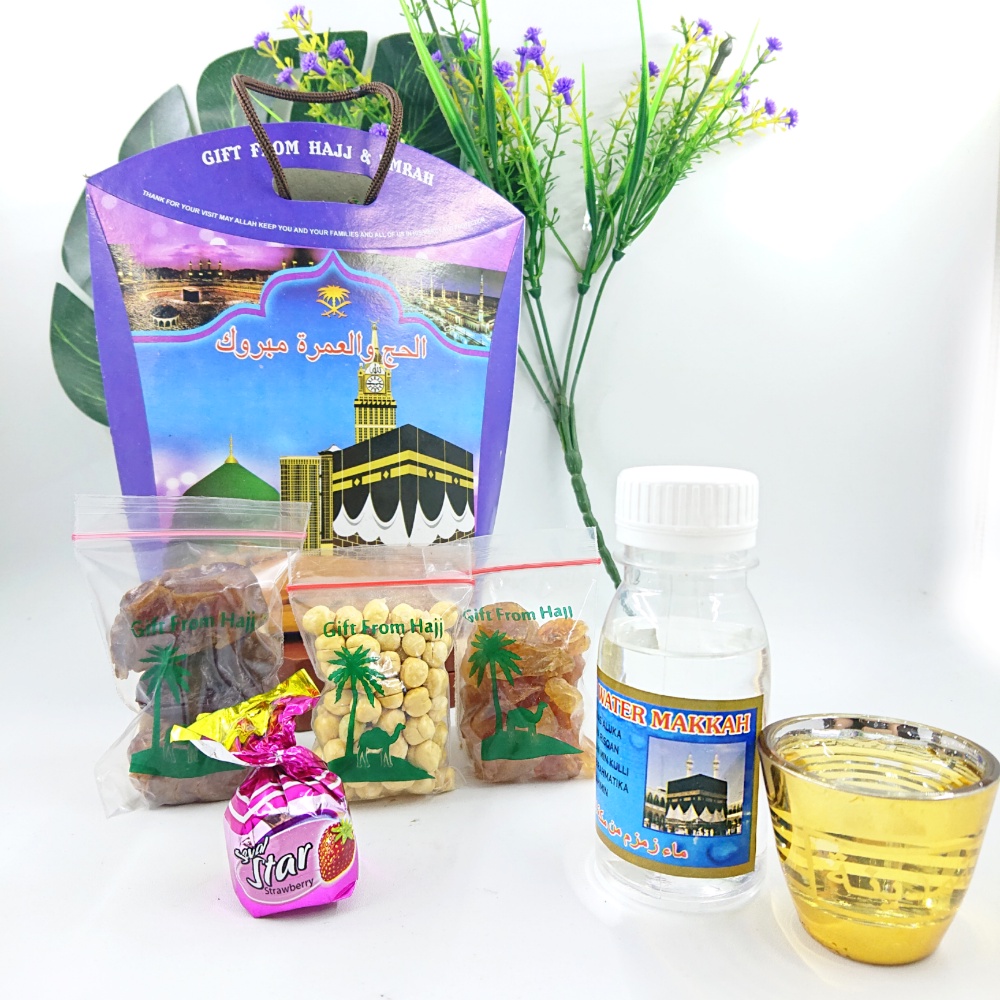 Paket D : 1. Kardus/ Tas 2. Kurma ± 30 gr 3. Kismis ± 15 gr 4. Kacang Arab ± 15 gr 5. Coklat Arab 1 pcs 6. Air Zamzam isi ± 50 ml