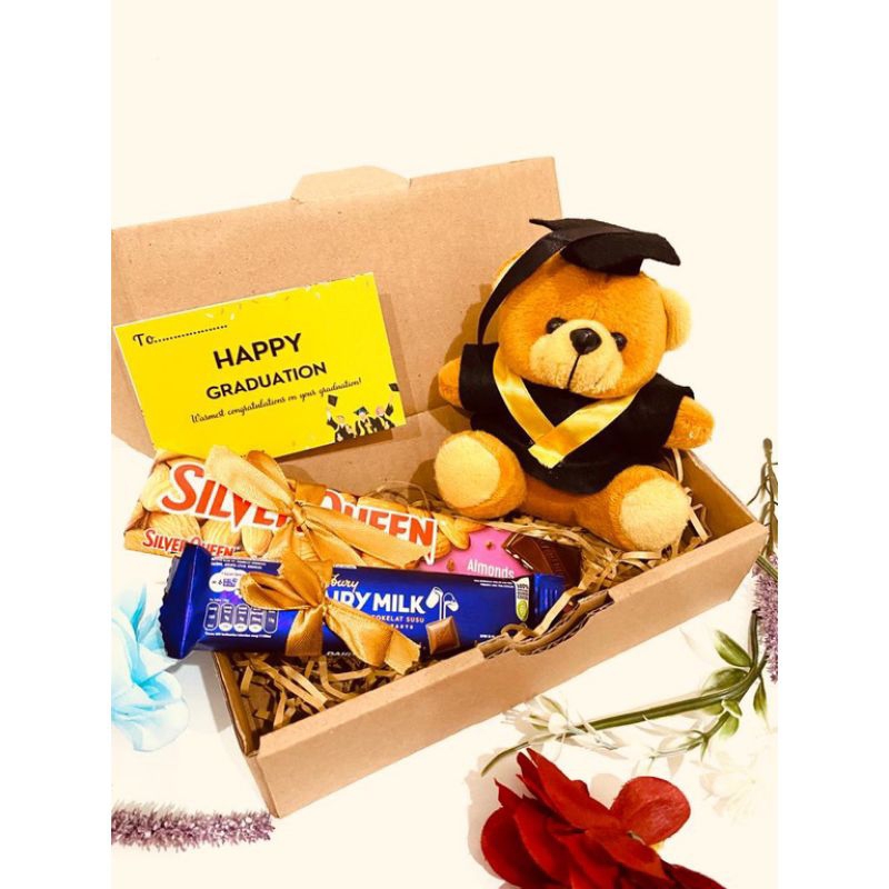PAKET W5 ( 2 Coklat + Boneka Wisuda Bear + Bunga Mini ) - 2 PCS Coklat ( SilverQueen + Dairy Milk ) - 1 PCS Boneka Wisuda Bear ( warna random ) - 1 PCS Buket Bunga - Box Hampers + Kartu Ucapan (Tuliskan di note Ucapan apa saja sewaktu Checkout)
