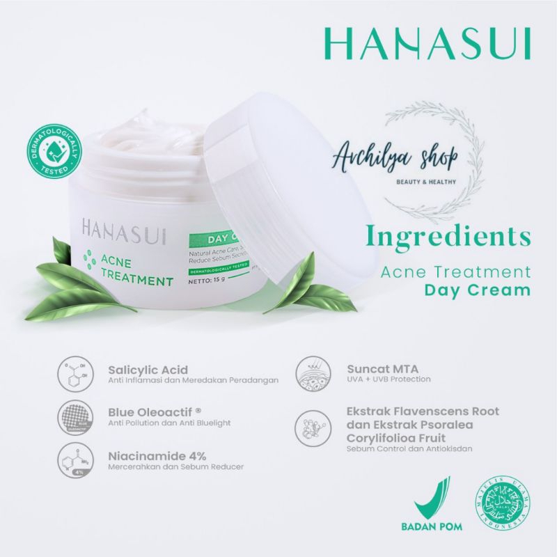 Kandungan bahan alami dan bahan aktif yang terdapat pada Hanasui Acne Treatment antara lain Salicylic Acid, AC.NET yang berfungsi sebagai anti bacteria, Niacinamide, Blue Oleoactif® yang berfungsi sebagai Anti Pollutan dan Anti Blue light serta Vitex Castus Extract yang merupakan anti acne dan anti microba untuk mencegah jerawat datang kembali.